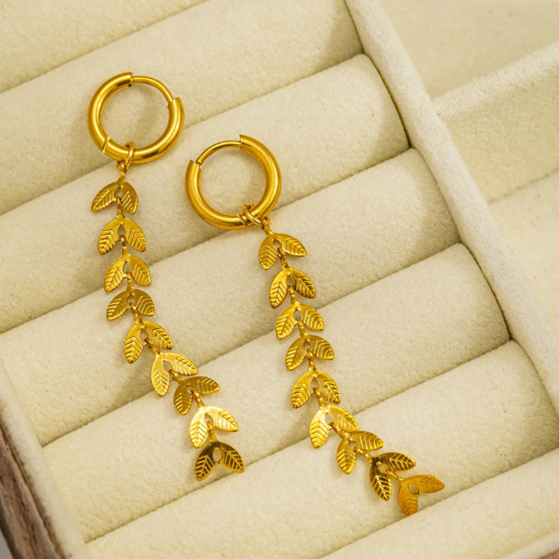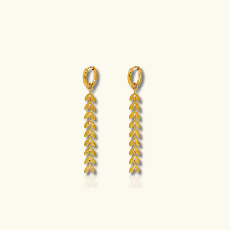 Deze Gouden Langbladige Oorbellen - Ariel hebben een slank gouden ontwerp, perfect voor elke gelegenheid.