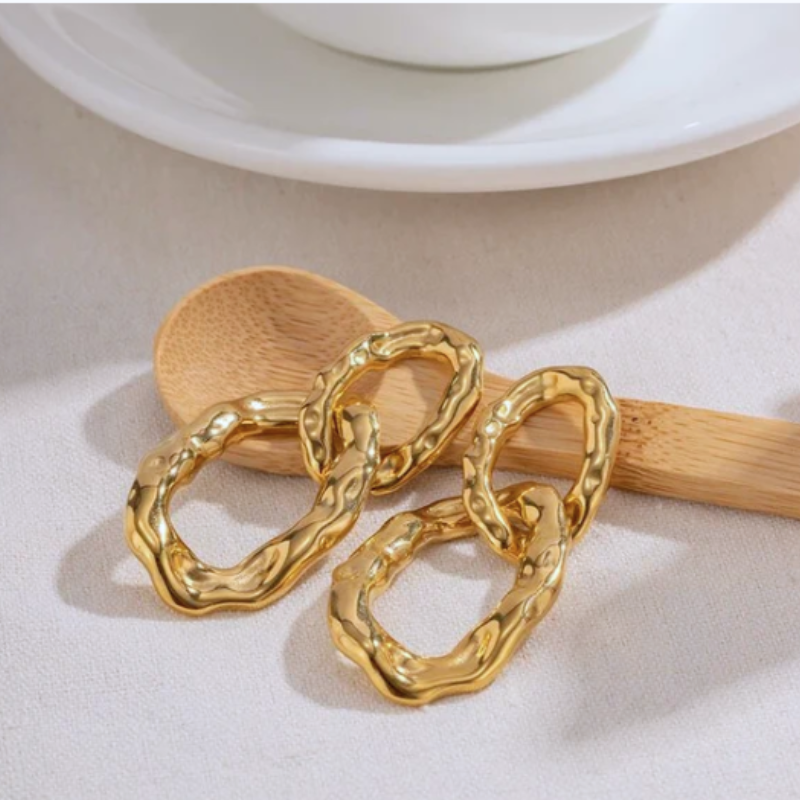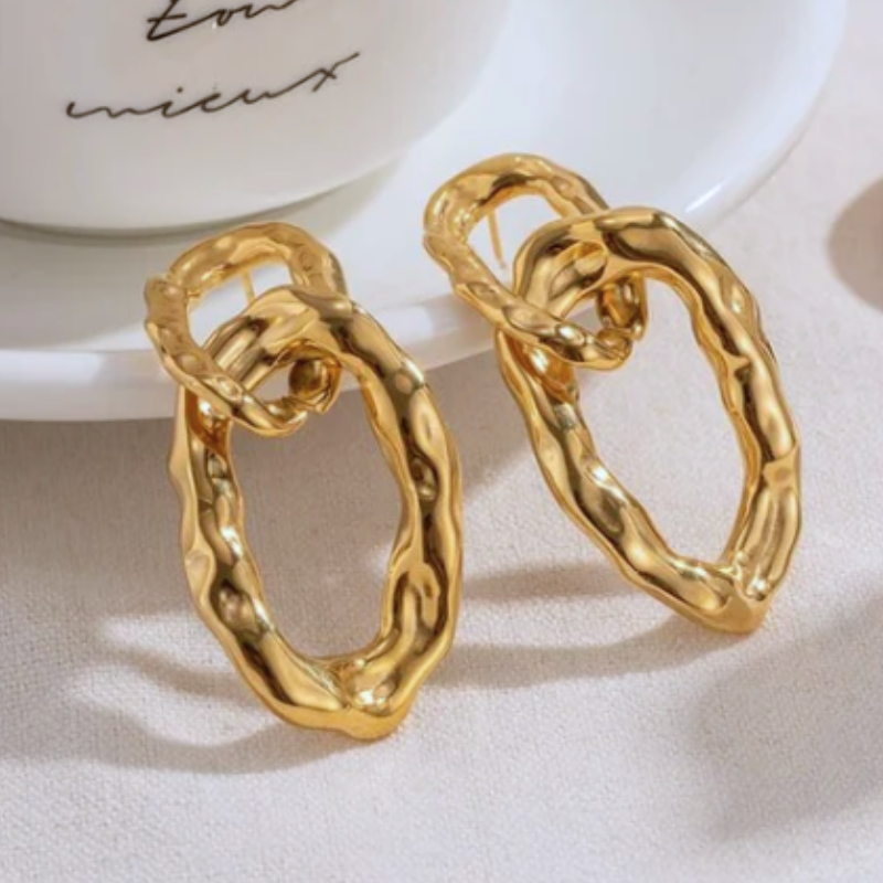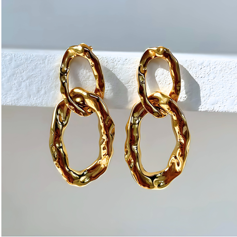 Verhoog je look met deze Goudkleurige oorbellen met dubbele ketting en textuur – Bianca, voorzien van een gedurfd in elkaar grijpend lusontwerp. Perfect voor dagelijks gebruik of speciale gelegenheden, paar ze met gelaagde gouden kettingen voor een verfijnde touch.