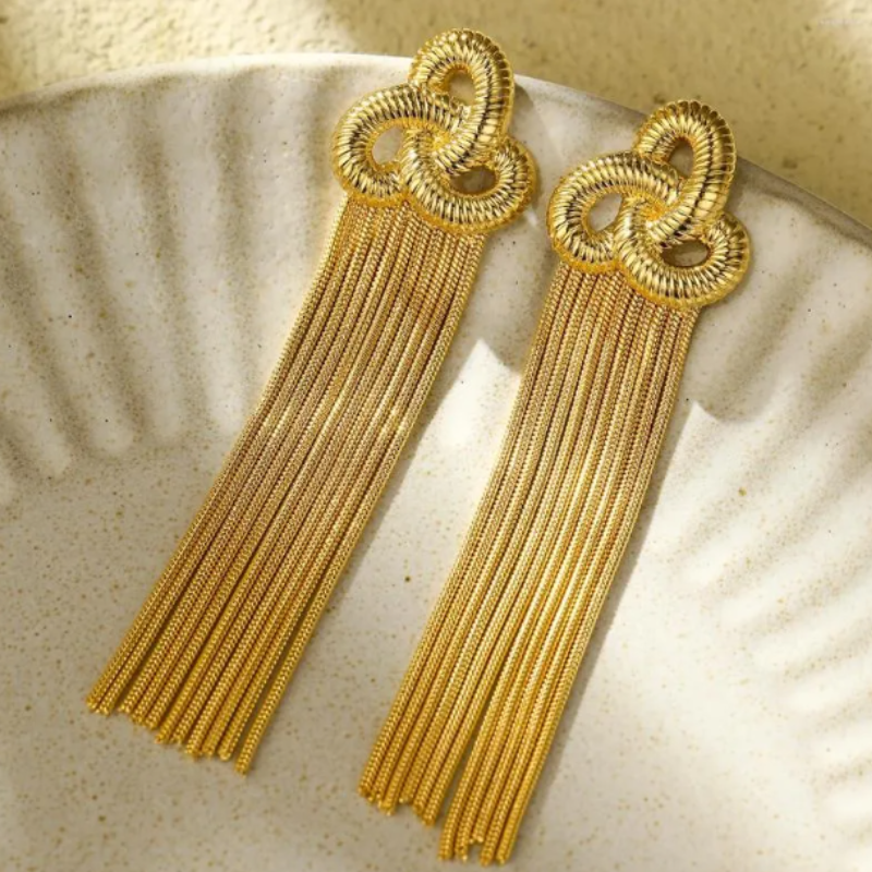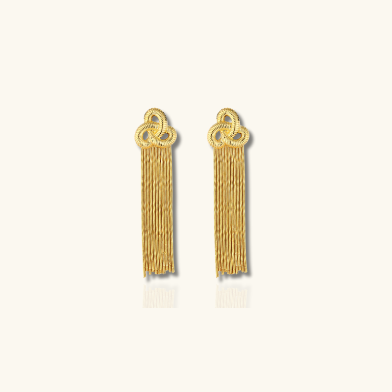 Elegant en opvallend, deze vergulde tassel oorbellen hebben een gevlochten knoop detail en vloeiende ketting franjes.