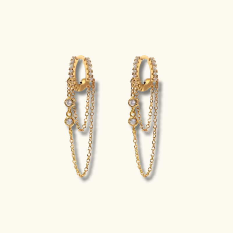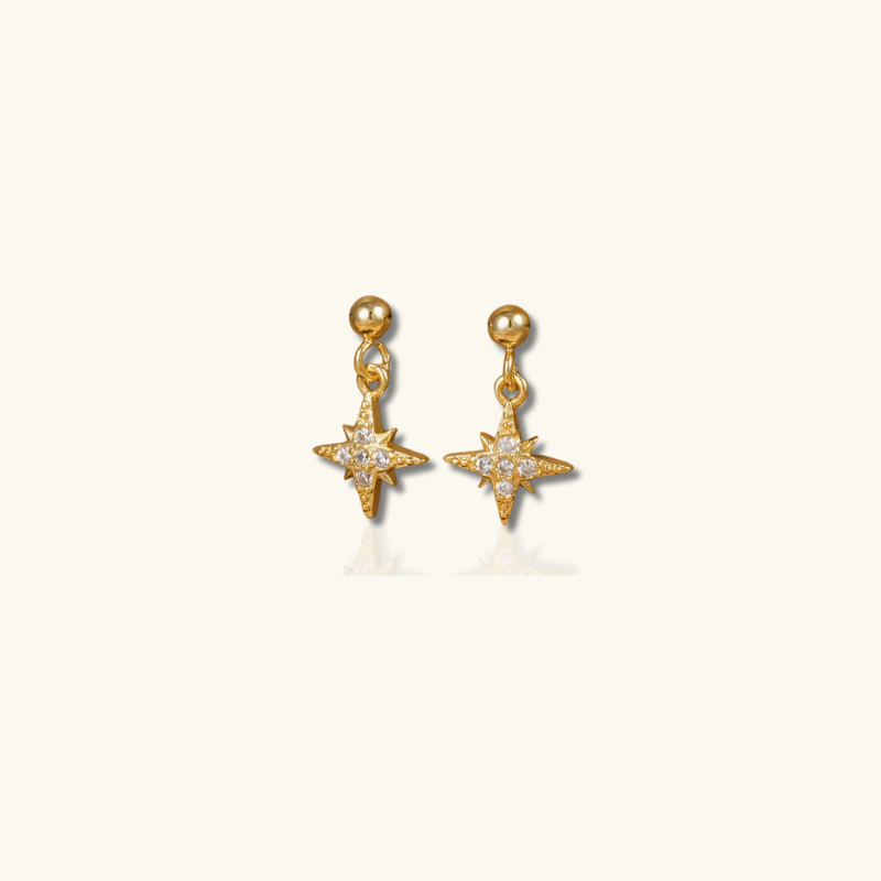 Elegante vergulde oorbellen met een oogverblindende ster bedel en delicate ketting, perfect voor elke gelegenheid. Combineer met gouden accessoires voor een verfijnde look.