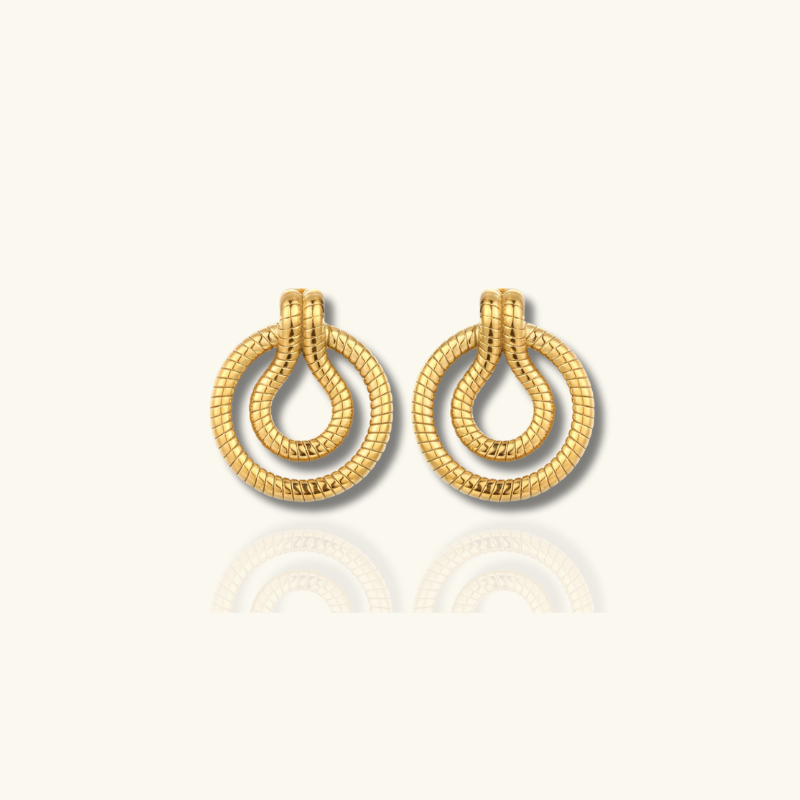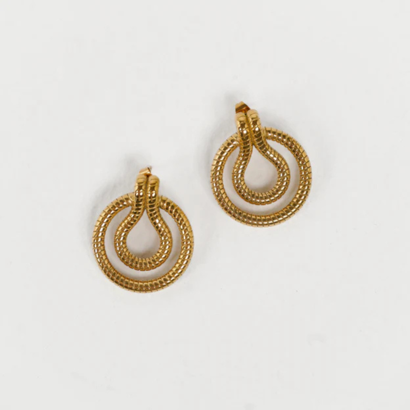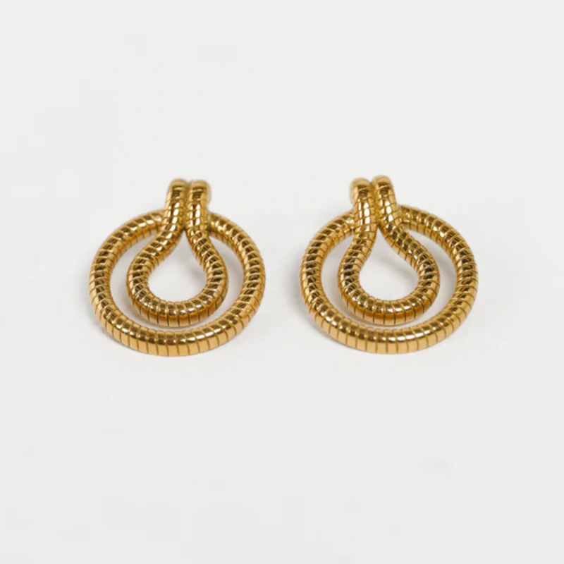 Maak een stoer statement met deze vergulde doolhof oorbellen. Perfect voor zowel casual als formele outfits en goed te combineren met gelaagde gouden sieraden.
