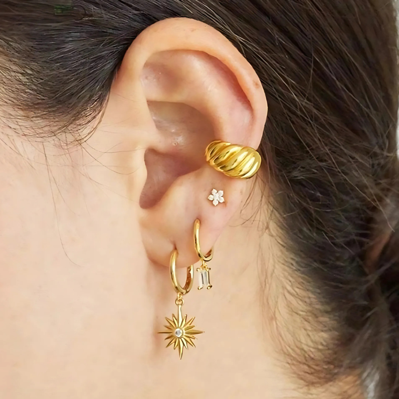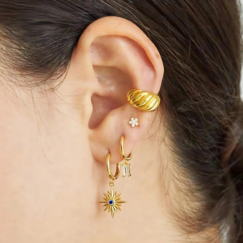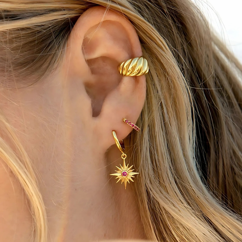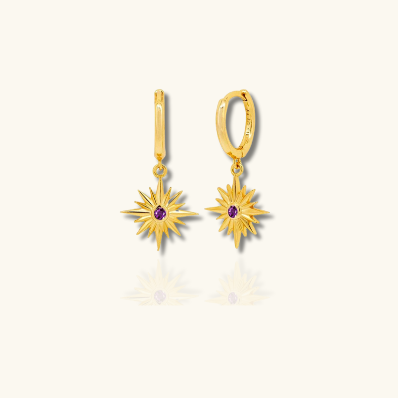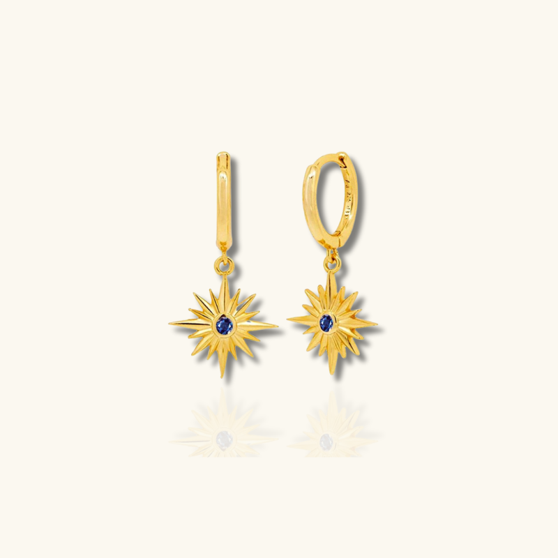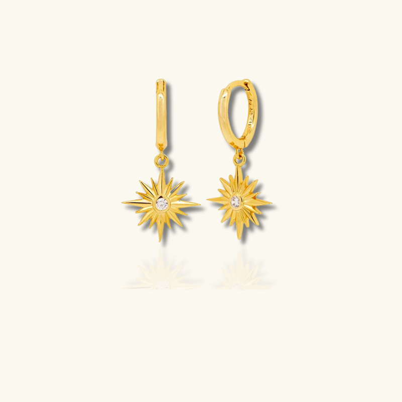 Prachtige vergulde hoepel oorbellen met een stralende starburst hanger en zirkoon edelsteen. Perfect voor elegante, hemelse looks.