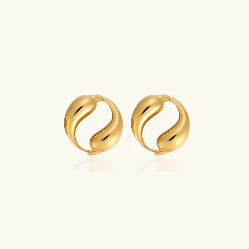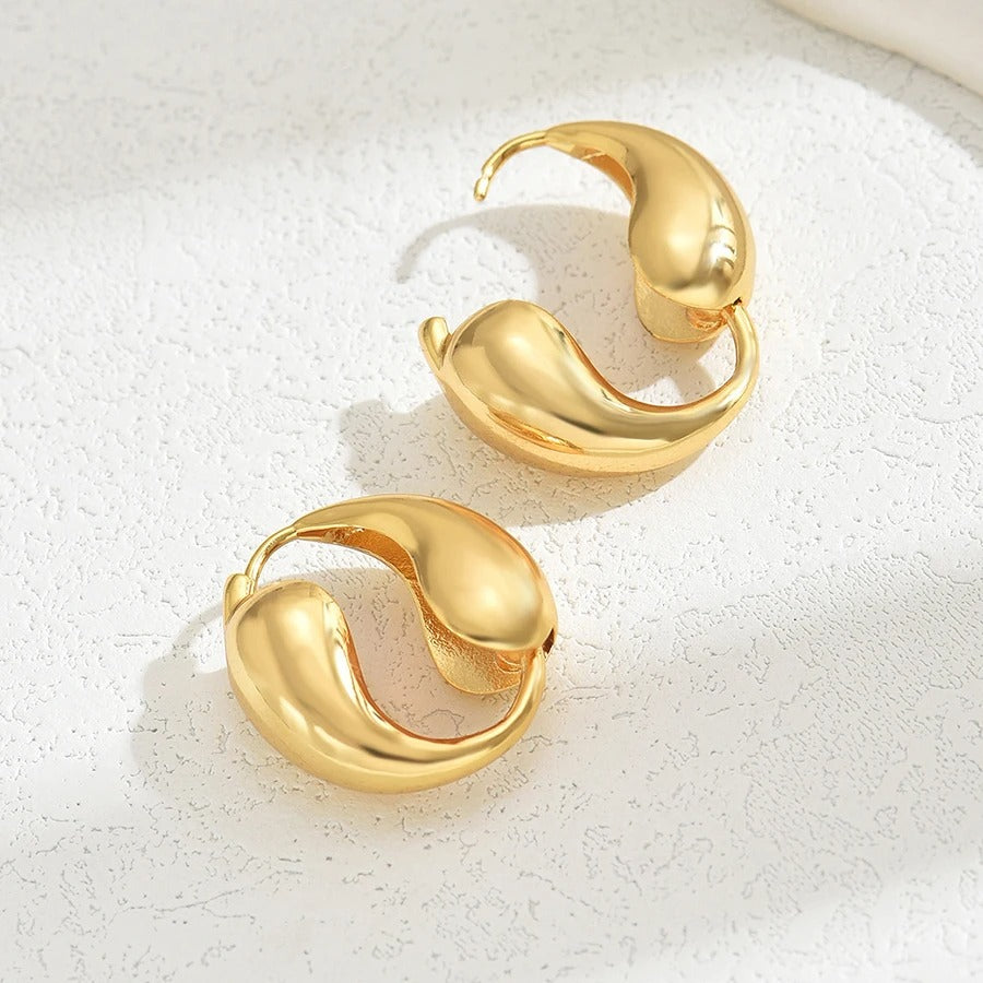 Deze Vergulde Waterdruppel Hoepel Oorbellen - Dana leveren een gedurfd en modern silhouet, perfect om minimalistische of avondoutfits op te leuken. Ze zijn waterdicht en aanslagvrij en passen goed bij strakke armbanden. Voorzichtig afnemen met een doekje om de glans te behouden.