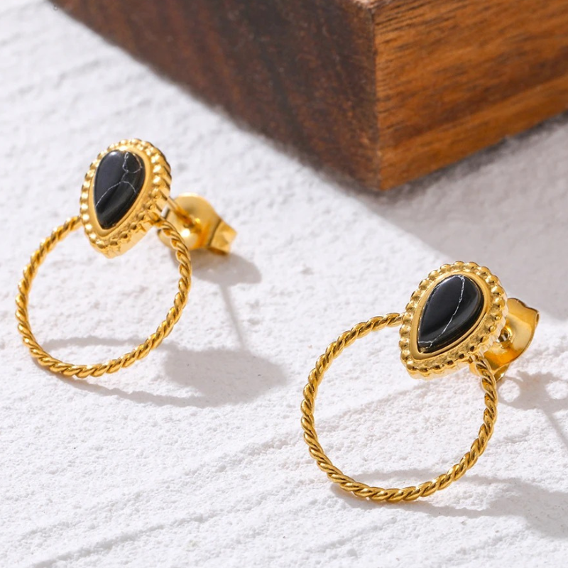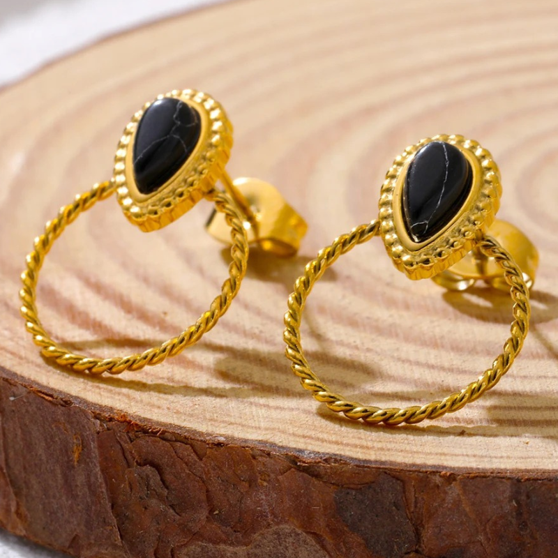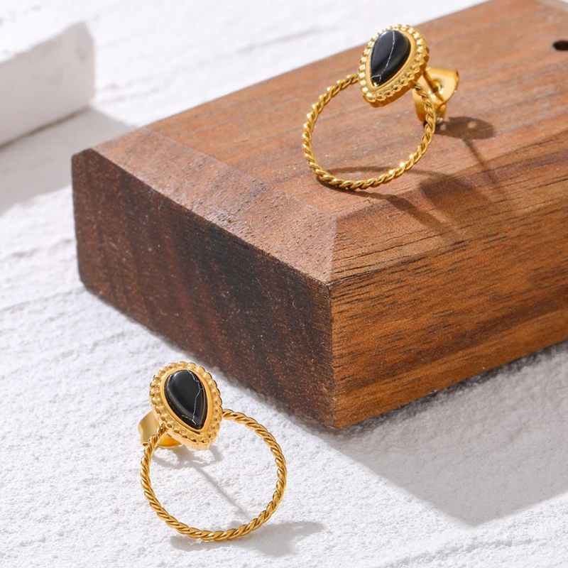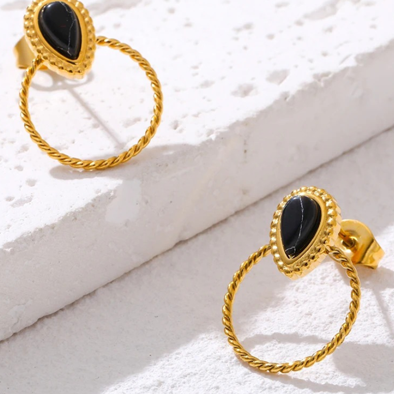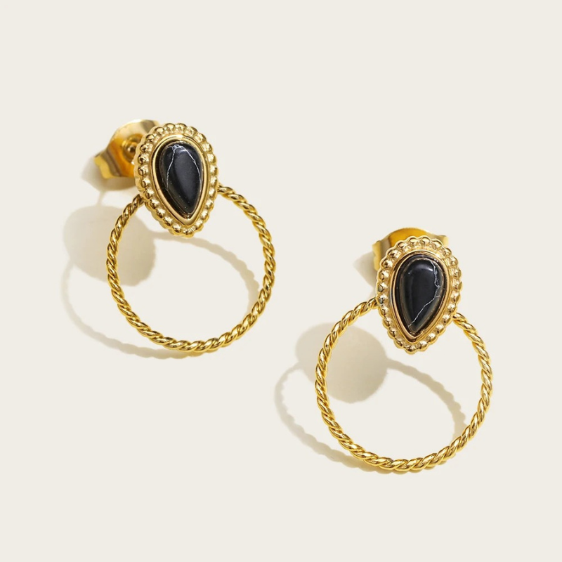 Verhoog je alledaagse look met deze Vintage Verguld Natuurlijke Steen Oorknopjes - Mona met een zwarte natuursteen. Perfect voor formele kleding of casual elegantie.